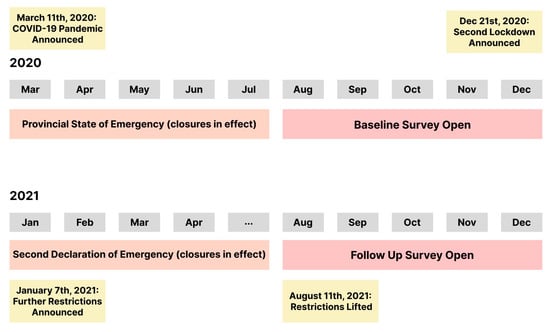 Timeline of the Return to Play Study Surveys and Provincial Mandates. Note: During provincial states of emergency (March–July 2020 and December 2020–August 2021), various closures and policies were in effect, including, but not limited to, stay-at-home periods, school closures, non-essential business closures (e.g., restaurants, gyms), and remote (work from home) work mandates for non-front line staff workers [].