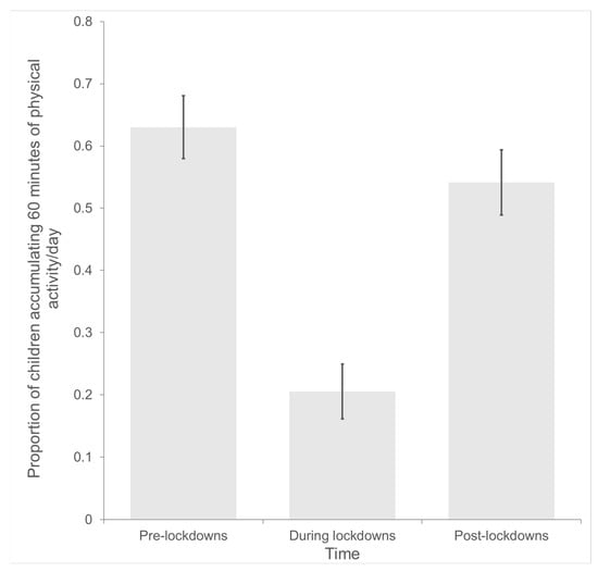 Proportion of children attaining 60 min of physical activity, as reported by parents, pre-lockdown, during lockdowns, and post-lockdown.