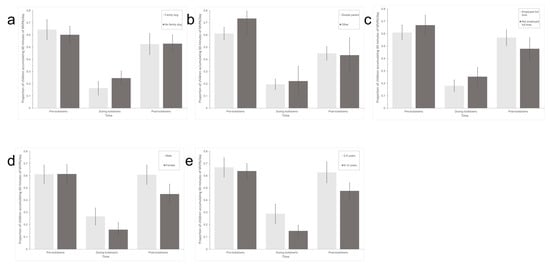 Difference in the proportion of children attaining 60 min of physical activity, as reported by parents, pre-lockdown, during lockdowns, and post-lockdown based on (a) owning a family dog, (b) family situation, (c) parent employ ent stats, (d) child sex, and (e) child age.