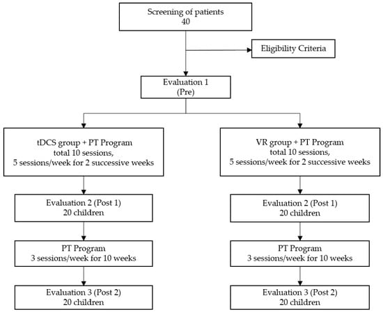 The study flow for this prospective randomized clinical trial is presented in Figure 1. The randomization was generated by block randomization. A convenience sample of 40 children (23 male, 17 female) were recruited from a specialized children’s outpatient clinic run by the faculty of physical therapy at Cairo University (Egypt). The inclusion criteria were the following: diagnosed with bilateral spastic CP and between the ages 7–12 years old; minimum spasticity grades of 1 and 1+ according to the modified Ashworth Scale; and gross motor function classification system (GMFCS) at level I or II. The age range was chosen to make sure the gait is matured and any changes were due to interventions rather than ongoing motor development [23]. GMFCS level was chosen to ensure that children could participate in both virtual reality and gait training [21]. Exclusion criteria included the following: children who had visual impairments, hearing damage, history of epilepsy or seizures, fixed deformities at lower limbs, history of orthopedic surgeries, or injection with botulinum toxin in the previous year; metal implants in the skull, or inability to understand the task. Prior to participation, the parents or legal guardians of the children provided verbal consent to participate, as approved by the ethical committee of the Faculty of Physical Therapy at Cairo University.