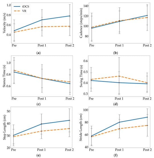 Mean and standard deviation of spatiotemporal parameters at Pre, Post 1, and Post 2 for the tDCS and VR groups, including (a) velocity, (b) cadence, (c) stance time, (d) swing time, (e) step length, and (f) stride length.