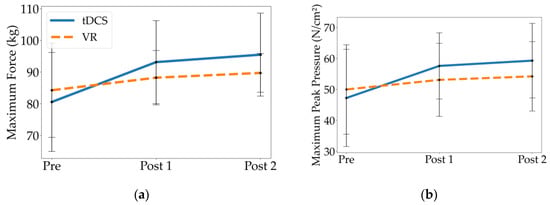 Mean and standard deviation of kinetic parameters at Pre, Post 1, and Post 2 for the tDCS and VR groups, including (a) maximum force, and (b) maximum peak pressure.