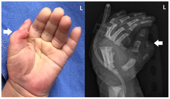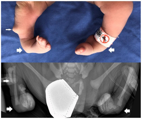 We present a newborn male infant who was delivered via elective cesarean section due to breech presentation with a gestational age of 38 weeks and 6 days, a weight of 3530 g (67 percentile), height of 51 cm (65 percentile), and Apgar scores of 9 and 10 at 1 min and 5 min, respectively. Decreased muscle tone and a wide anterior fontanelle were not observed, which are generally observed in FMS newborns. However, congenital anomalies were observed, such as a skin pouch on the right tibial area, club feet (Figure 1), oligodactyly on the right first toe and left first and second toes, syndactyly on the third and fourth toes (Figure 2), and radial polydactyly on the left hand (Figure 3). Other deformities, such as cranial dysplasia, facial anomalies, cryptorchism, hypospadias, micropenis, and a bifid scrotum, were checked for, but they were not observed in this case. Along with the limb malformation, a single umbilical artery was identified, and the newborn was admitted to the neonatal intensive care unit. Blood tests performed at admission showed Hb 17.8 g/dL, Hct 51.8%, WBC 11,480/μL, Platelet 291,000/μL, C-reactive protein (CRP) 0.53 mg/L, pH 7.36, PCO2 40 mmHg, PO2 57 mmHg, Base Excess −2.8 mM/L, and HCO3− 22.6 mM/L.