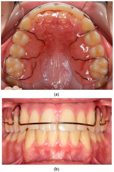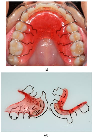 The stainless steel wire is cylindrical in cross-section, 0.28″–0.32″ in diameter. Carefully adapted to fit intimately on the labial surfaces of the anterior teeth (maxillary or mandibular), it has loops corresponding to the canines. The most commonly used clasp is of the Adams type, mainly applied around the first permanent molars, providing resistance to displacement. Alternative clasp types are the peripheral ones, easy to manufacture and gingivally friendly, but contraindicated in the cases of teeth with reduced clinical crown height and lacking anatomical shape due to the ensuing inadequate retention. Additionally, the ball clasps, most commonly fitted on posterior teeth (premolars), are in contact (Figure 1c). The acrylic base plate keeps wires and other components (e.g., screws, springs) in a proper position in relation to teeth. It needs to fit passively at the palatal or lingual gingival margins to provide tooth support, increasing retention []. Properly fabricated springs may be added to correct minor dental relapse (Figure 1d). Adding colors and cartoon figures makes the appliances friendlier for younger patients and may even improve their compliance (Figure 1e).