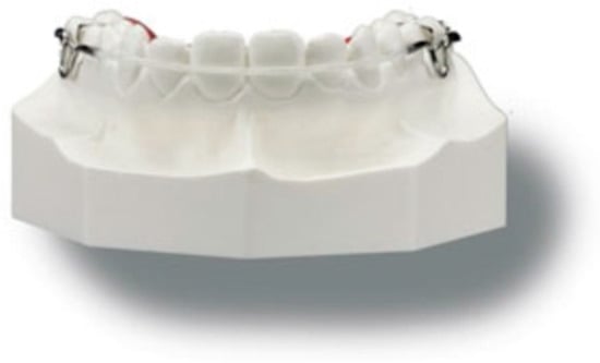 It is a transmaxillary, removable appliance, considered one of the most effective retention devices ever invented. It is custom-made, fabricated in the lab from resilient translucent silicone (Figure 5) with the aid of a cast with teeth that have been properly set-up. It has also been used to correct minor intra- and inter-arch irregularities in cases where active treatment needs to cease prematurely. It may cause minor, programmed tooth movement, while respecting the gingival tissues. However, long-term compliance is questionable because some patients consider it unaesthetic, bulky, and dysfunctional. However, it could allow for earlier completion of active treatment, promote small space closing, and minor rotation or buccolingual correction. It could even alleviate some occlusal discrepancies. It improves lip competence and facial muscular tone. It could be used to correct second molar crossbites, and to control overjet. However, it is not possible to achieve more than 1–2 mm of respective tooth tipping [,].