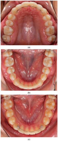 Two alternatives have been used, namely an intercanine lingual/palatal wire bonded on all six anterior teeth (canine to canine) (Figure 6a,b), or lingual/palatal intercanine wire bonded only to the canine lingual/palatal surfaces (canine and canine) (Figure 6c) [,,]. The latter alternative is regarded as more effective in preventing changes in the intercanine dimension, but may not keep the dental units in their designated position, potentially culminating in future crowding []. The wire required is 0.30″ of stainless steel, and there is a need for sand-blasting the canines’ lingual surfaces.