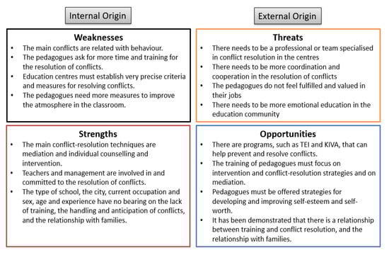 To end, the following SWOT analysis brings together the QUAN and QUAL results to show the main internal and external conditions that were observed (Figure 3).