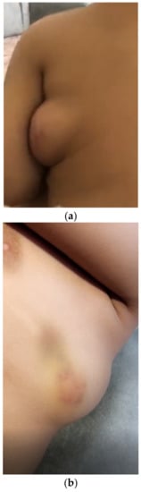 On examination, there was a single, oval-shaped mass measuring around 6 × 4 × 2 cm located on the left lateral chest wall (Figure 1a,b). The mass was mobile, non-tender, soft, and compressible. The overlying skin had a red/blue hue. The mass was attached to the overlying skin but not to the underlying structures. There was positive transillumination, and on auscultation there was no bruit. The rest of the physical examination was unremarkable.