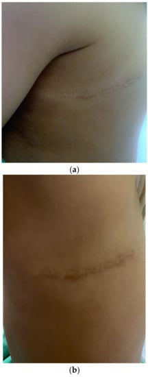 The preliminary diagnosis was that of a lymphatic malformation, and the patient was referred to a tertiary hospital for further management. A thorough discussion of three different treatment modalities, namely expectant management, sclerotherapy, and surgery was had with the family. Although the lesion was small, well-localised, and not impinging on vital structures, expectant management was dismissed as the pre-verbal patient seemed preoccupied with the mass, persistently pulling on the lesion, and voicing sounds suggestive of discomfort. As for sclerotherapy, the patient would require sedation and possibly general anaesthesia. Furthermore, repeat sclerotherapy might be warranted in the event of incomplete resolution. Based on imaging, total resection of the mass was likely feasible. To that end, possible complications with surgery and the remote risk of recurrence were explained in detail. Upon further discussion, the parents shared their preoccupation with a diagnosis of a malignant mass. Conclusively, a decision for surgery was made. In the operating room and under general anaesthesia, an incision was made over the lesion. Circumferential dissection was made using both blunt and sharp dissection. The lesion was found to be attached to the fascia of the underlying latissimus dorsi and overlying skin. The fascia of the muscle was excised, and the skin was trimmed. The subcutaneous tissue was approximated, and the wound was closed using absorbable sutures. Finally, surgical tape strips and a pressure dressing were applied. The patient tolerated the procedure well, with no postoperative complications. The postoperative histopathology report described dilated lymphatic channels lined by endothelial cells. Histopathology was compatible with a diagnosis of a macrocystic lymphatic malformation. The patient has had no recurrence of the lesion in the two years of follow-up post-excision (Figure 4a,b).