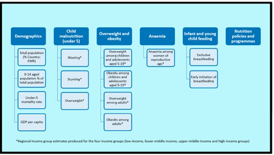 In this article, the nutrition status of different income groups in the EMR is discussed and illustrated. Data for the demographics, children under five malnutrition, infant and young child feeding (IYCF), anaemia in women of reproductive age, overweight and obesity among children and adolescents aged 5–19 and adults, in addition to existing nutrition policies and strategies in the EMR are summarized. For overweight and obesity among children and adolescents (aged 5–19 years) as well as adults, age-standardized estimates were obtained from the NCD Risk Collaboration, which in turn, are based on data provided to WHO and the NCD Risk Factor Collaboration [2]. Adjustments were performed by the NCD Risk Factor Collaboration to standardize risk factor definition, age groups, reporting year, and population representativeness for these estimations. To account for disparities in population age/sex composition and to allow comparisons between nations, age-standardized prevalence figures were produced by the NCD Risk Factor Collaboration [2]. Overweight and obesity for adults are defined as BMI of 25 kg/m2 or higher and BMI of 30 kg/m2 or higher, respectively, while for children and adolescents (aged 5–19 years) they are defined as BMI greater than one and two standard deviations (SD) above the median, respectively. Additional data were collected from recent national surveys [34,35,36,37,38,39,40].