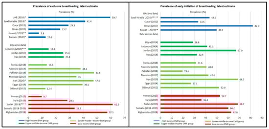 Comparison of the latest country-specific estimates shows no correlation between the income level and the prevalence of early initiation of breastfeeding or exclusive breastfeeding. The highest estimate for early initiation of breastfeeding was recorded in Oman (82.0% in 2017), followed by Iran (68.7% in 2010) and Sudan (68.7% in 2014), then Jordan (67.0% in 2017). Highest estimate for exclusive breastfeeding was recorded in Sudan (61.5% in 2018), followed by UAE (59.7% in 2018), and Afghanistan (57.5% in 2018). The lowest estimates, in turn, were recorded in Pakistan (19.6% in 2018), Egypt (27.1% in 2014), and Libya (28.8% in 2014) for early initiation of breastfeeding, and in Kuwait (7.8% in 2019), Yemen (9.7% in 2013), and Djibouti (12.4% in 2012) for exclusive breastfeeding (Table 4 and Figure 4).