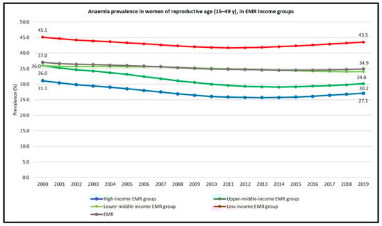 Anaemia prevalence trend in women of reproductive age (15–49 y) in the EMR income groups 2000–2019 [20].