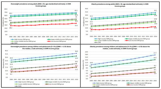 Overweight and obesity prevalence trends among children, adolescents, and adults in the EMR income groups 2000–2016 [20].