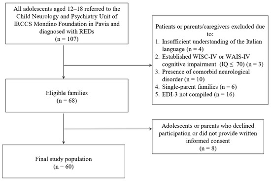 Sixty adolescent patients were enrolled at the Child Neurology and Psychiatry Unit of the tertiary care Scientific Hospitalization and Treatment Institution Mondino Foundation in Pavia, a city in northern Italy. Inclusion criteria were being between the ages of 11 and 18 (extremes included) and having received a diagnosis of RED according to the Diagnostic and Statistical Manual of Mental Disorders (DSM-5) criteria [24]. RED diagnosis could include any restrictive and binge-eating/purging subtypes of anorexia nervosa (AN), atypical anorexia nervosa (A-AN), or other specified eating disorders with restrictive characteristics. Patients with any comorbid neurological disorders were not eligible for the study. REDs diagnoses were confirmed by administering the DSM-based Kiddie Schedule for Affective Disorders and Schizophrenia (K-SADS-PL DSM-5) [25,26], which was also used to exclude patients with any comorbid neurological disorders (e.g., autism spectrum disorder, or other psychiatric diseases). Intellectual disability was assessed using age-appropriate Wechsler intelligence scales [27,28]. and personality disorders in structuring were evaluated through the Structured Clinical Interview for DSM-5—Personality Disorders (SCID-5 PD) [29]. We also excluded patients and parents who did not understand the Italian language. Figure 1 shows the study population flowchart. The cross-sectional study was approved by the Ethics Committee of the Policlinico San Matteo in Pavia (Protocol ID: P-20170016006) and performed according to the Reporting of studies Conducted using Observational Routinely collected health Data (RECORD) statement (Supplementary Table S1). All patients and their caregivers provided written informed consent to the study. The authors assert that all procedures contributing to this work comply with the ethical standards of the relevant national and institutional committees on human experimentation and with the Helsinki Declaration of 1964 and its later amendments. The dataset is available upon request in Zenodo [30].