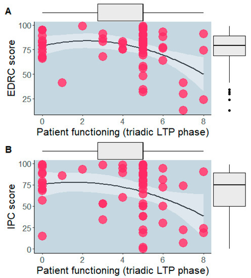 Significant quadratic associations emerged for the patient’s score during the triadic phase with EDRC score (R2 = 0.11, F = 7.37, p = 0.009, B = −0.40, t = −2.72, p = 0.009, 95% CI [−0.69:−0.10] (excluded linear association, p = 0.499)) and IPC score (R2 = 0.10, F = 6.37, p = 0.014, B = −0.54, t = −2.52, p = 0.014, 95% CI [−0.97:−0.11] (excluded linear association, p = 0.142)) (Figure 2). No significant linear or quadratic associations emerged for the other LTPc phases.