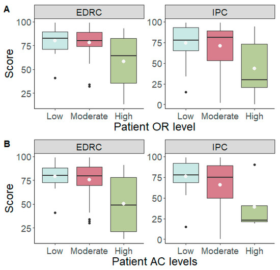 Significant differences emerged for the patient’s OR during the triadic phase in EDRC score (F (2.57) = 5.51, p = 0.007, η2p = 0.16) and IPC score (F (2.57) = 5.19, p = 0.009, η2p = 0.15). Post hoc analyses revealed that patients with high OR score had lower EDRC and IPC score compared to counterparts with low and moderate OR score. Additionally, significant differences emerged for the patient’s AC during phase 3 (triadic phase) in EDRC score (F (2.57) = 3.82, p = 0.028, η2p = 0.12) and IPC score (F (2.57) = 3.04, p = 0.055, η2p = 0.10). Post hoc analyses revealed that patients with high AC score had lower EDRC and IPC score compared to counterparts with low and moderate AC score (Figure 3).