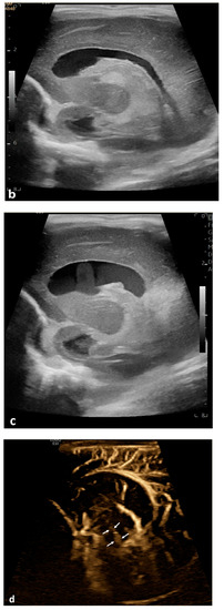 - Goeral, K.; Hojreh, A.; Kasprian, G.; Klebermass-Schrehof, K.; Weber, M.; Mitter, C.; Berger, A.; Prayer, D.; Brugger, P.C.; Vergesslich-Rothschild, K.; et al. Microvessel ultrasound of neonatal brain parenchyma: Feasibility, reproducibility, and normal imaging features by superb microvascular imaging (SMI). Eur. Radiol. 2018, 29, 2127–2136. [Google Scholar] [CrossRef] [PubMed]