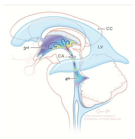 Illustration of caudocranial cerebrospinal fluid (CSF) flow direction, circulating from the fourth ventricle, passing through the cerebral aqueduct into the third ventricle (arrows). CC, corpus callosum; CSF, cerebrospinal fluid; LV, lateral ventricle; 3rd, third ventricle; CA, cerebral aqueduct; 4th, fourth ventricle. Modified from Hwang et al. with permission.