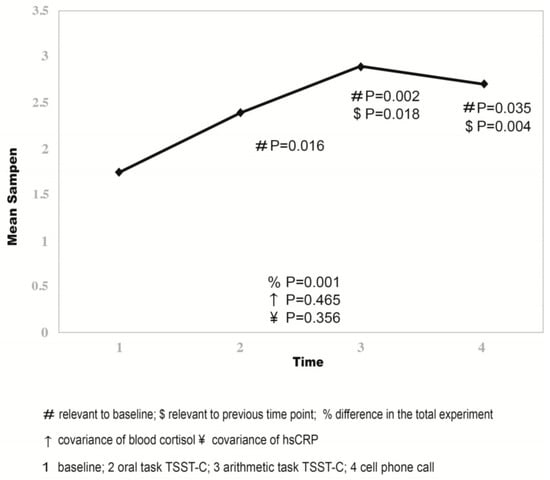Non-linear computations of ANS (heart rate variability (HRV)) dynamics and complexity were performed with MATLAB software. SampEn was introduced as a measure of complexity and regularity of brief time series that corrects Approximate Entropy [] inherited bias, and thus becomes sensible and credible for very short and noisy time series (<200 beats). SampEn (m, r, and N) is defined as the negative natural logarithm of the conditional probability that two sequences within a time series of length N that are similar for m points remain similar for m + 1 points, within a tolerance of r []. We opted to use m = 2 and r = 0.2, as proposed in literature for HRV analysis []. The computed SampEn for each time was statistically analyzed with RANOVA, same as endocrine measurements. Its mean value covariance with baseline circulating hsCRP and cortisol were evaluated with RANCOVA, while effect sizes were calculated as well. The statistical significance p value was set at <0.05. Statistical analyses were performed by SPSS Version 17 Software.