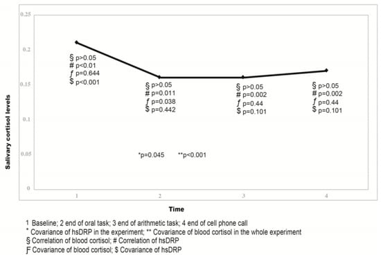 Salivary cortisol levels (μg/dL) during exposure and its covariance with baseline circulating hsCRP and cortisol.