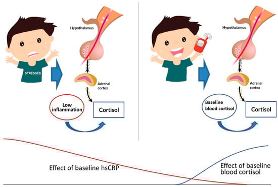 The effect of circulating hsCRP decreased over time, contrary to the baseline circulating cortisol effect that increased (Table 4 and Table 5, Figure 4); thus, the HPA axis reaction to the third stimulation—the 3-min cellular phone call—depended on the baseline circulating cortisol levels [,]. It is highly associated with entities such as obesity [], renal failure, airway inflammation [], and autoimmune diseases [], which were a priori excluded in our study. As far as children and schoolchildren are concerned, hsCRP concentration has also been reported to be associated with sleep-disordered breathing. The additional threshold detected (if hsCRP levels were higher than 1.663 mg/L, the effect of covariance tended to become apparent over time) should be checked in larger-sized samples. This would probably provide us with a narrower percentile or accurate cut-off point. Notably, the baseline circulating markers hsCRP and cortisol negatively correlated with each other, with a correlation coefficient of −0.632 and a significance level p = 0.021, confirming the contradictory dynamics observed during consecutive extrinsic stimuli, as shown herein.
