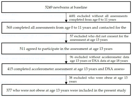 Of the 415 Pelotas Study participants who had accelerometry and DXA data, we excluded 38 participants (9.2%) with obesity at the 13-year assessment. A total of 377 Pelotas participants (189 males and 188 females) were included for analysis. Figure 1 illustrates the participant flow chart.