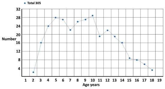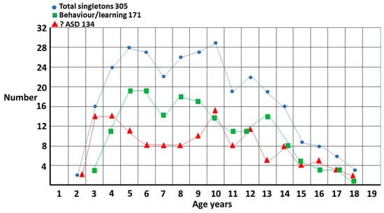 The total singleton graph (Figure 1) is fairly smooth though there appears to be a possible double peak at 5 years and 10 years. This accords with clinical experience. The onset of school and the onset of puberty are stressful times for girls and the fact there is a problem becomes evident. There are, however, two different subgroups (Figure 2). The first is where ASD is suspected and is the reason for referral. The pattern is clearly biphasic. A subset at ~3–5 years either has very clear features of ASD or there is some knowledge of ASD within the family that triggers a referral (?ASD). If they are missed, then camouflaging at school is quite effective [] until they enter puberty where the extra stress makes the problem evident. Those in the other subgroup are those picked up at school with either behavior or learning problems and correctly diagnosed as ASD by the clinician (behaviour/learning). This group is often initially diagnosed as attention deficit disorder, which may be present but acts as a distractor for the comorbid ASD, in particular for girls where the diagnosis may be delayed for over 2 years []. This may be further complicated because attentional problems are probably a feature of ASD []. There appears to be a possible extra pubertal peak at around 13 years which makes sense since they are not likely to be picked up as early as the ?ASD pubertal subset, which shows clearer features of ASD.