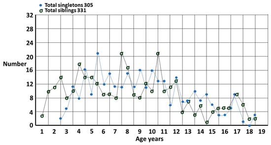 The difference in proportions of singletons diagnosed by 96 months of 39.7% and siblings diagnosed of 48.6% was significant by χ2 for proportions. χ2 = 5.087 DF = 1 φc 0.089 p = 0.024.