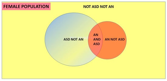 Autistic spectrum disorder (ASD) is a life-long neurodevelopmental condition with problems in socialization and communication, restrictive interests and repetitive behaviors. It is highly genetically determined and underdiagnosed in females with negative long-term consequences []. In a previous paper [], identifying biases against the recognition and diagnosis of ASD females, the estimated female population prevalence was about 6%, much higher than current estimates. This result was cross-checked by identifying more visible comorbidities (borderline personality disorder, BPD) and using BPD as a test for the prevalence of female ASD, employing Bayes’ theorem (Section 1.3). The value found was 6.0%. This paper will similarly explore this, using anorexia nervosa (AN) in the same way. AN is a serious eating disorder, predominantly in females, which is life-threatening if neglected []. Compared to female ASD it is relatively easy to detect (see Section 2.5). The value of finding the true prevalence of ASD is that it may be a common comorbidity of many mental health conditions and not recognizing ASD generally makes clinical management more difficult and less successful.
