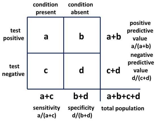 The second form of Bayes’ theorem employed is the 2 × 2 table (Figure 5), commonly used to assess the outcomes of a clinical test for a particular condition. This provides a probability that a positive test reflects the presence of a condition or a negative test reflects its absence. These are the positive and negative predictive values, respectively.