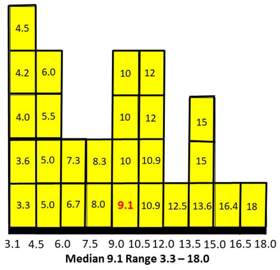 The median value (in red) is not in the centre of the numerical range and so the values were then plotted as percentages on a histogram to establish the pattern of results (Figure 6).