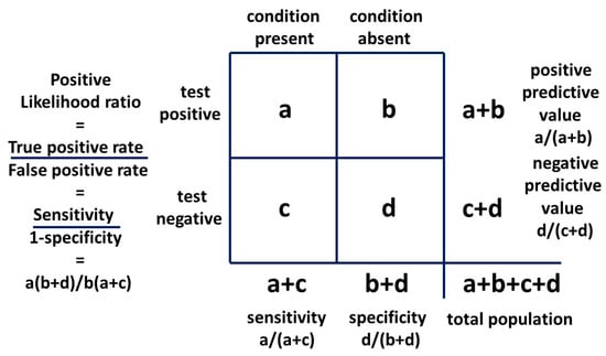 The 2 × 2 table also provides likelihood ratios. The positive likelihood ratio (LR+) is the ratio of the probability that the positive test result is a true positive for the condition present and the probability that the positive test result is a false positive for the condition absent, given by: