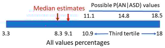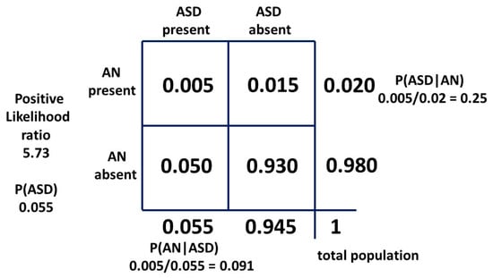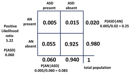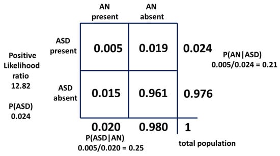 Since AN is far easier to recognize than ASD in females, the clinical value of P(ASD|AN) is high. The proportion of ASD is clinically significant (Table 2) and there is evidence that these patients do poorly unless the underlying ASD is recognized []. We will use this simple algebraic form of Bayes’ theorem to estimate P(AN|ASD) in Section 2.1.