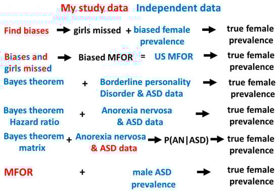 An essential intermediate step examines data detailed in current peer-reviewed literature, to find solutions to the proportion of females with ASD who develop AN at some time in their lives, designated P(AN|ASD). P stands for probability, in this case, a conditional probability, but it is equivalent to prevalence in the population of interest. Proportion, in context, may be a synonym for both. P(AN|ASD) would provide further information on the true prevalence of ASD in females, designated P(ASD). The study provides new epidemiological information from the patient dataset detailed previously []. It looks at published information in novel ways consistent with Bayesian reasoning and is, therefore, an exercise in quantitative induction []. The task faces four major challenges:
