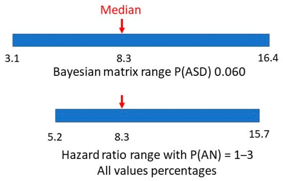 A hazard ratio looks at how the rates of occurrence of the two conditions compare over time. The study adjusted for multiple variables in eight consecutive cohorts to arrive at a final single numerical hazard ratio of 5.22 for individuals with ASD getting a second diagnosis of AN, compared to individuals without ASD getting a diagnosis of AN. Having allowed for the variability in the hazard ratio with large numbers over time, this would be similar to a relative risk. If the estimated range of prevalences of AN is 1–3% this would give a range of P(AN|ASD) of 5.22–15.66%. In Figure 7, we compare the range of values of methods one and two.