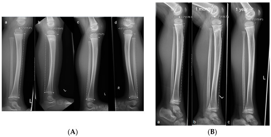 Measurements of the anterior tilt angle of the proximal tibia in children with trampoline fracture. (A) Radiographs of a child with a torus fracture. Measurements were taken (a) on the day of the accident; (b) after one month, and (c) after one year; (d) x-ray of the healthy opposite leg. The negative anterior tilt angle (−4.8°) at one year indicates complete remodeling. (B) Radiographs of a child with a complete fracture. Measurements were taken (a) on the day of the accident, (b) after one month, and (c) after one year. The negative anterior tilt angle at one year (−6.4°) shows complete remodeling.