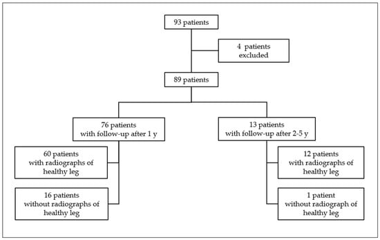 We identified 93 children, aged 2 to 5 years, that had sustained a trampoline fracture during the period of October 2011 to December 2019 (Figure 2). Four children had to be excluded from the study: two children because their parents refused to participate in the study and two other children because they could not provide a lateral radiograph of the lower leg at the final examination. Therefore, the study included 89 children with an evaluable radiograph of the tibia on the day of the injury and a final examination at least one year (range 11–16 months, median 12 months) after the trauma. In addition, 13/89 patients (14.6%) had a final x-ray taken between 2 and 5 years (range 20–64 months, median 36 months) after the injury. The cohort included 40 males (45%) and 49 (55%) females. The mean age was 3.3 years (SD 1.2). In 72/89 patients (80.9%), we could compare anterior tilt angles between the affected and healthy legs.