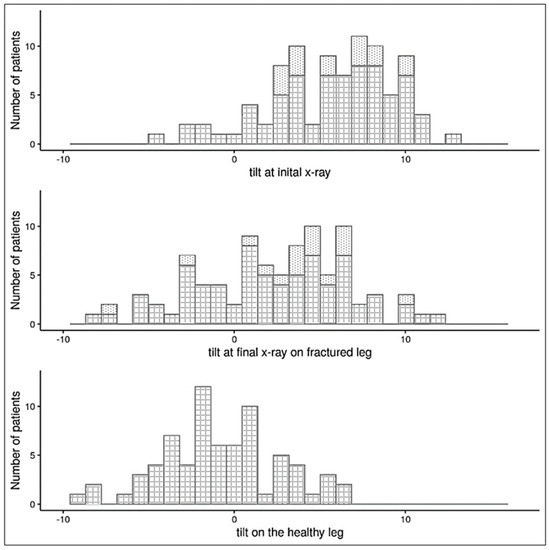 In our study population, the anterior tilt angles of the proximal tibia of the healthy legs ranged from −9.4° to +6.2° (mean −0.7336°, Table 3). This finding suggests that children of this age might have a physiologically positive anterior tilt angle in the absence of a fracture or have been exposed to repetitive trauma to the proximal tibia while jumping on the trampoline (Table 3 and Table 4). In our previous study, we found chronic repetitive changes such as sclerosis of the metaphysis, growth arrest lines (Harris lines), and widening of the growth plates in children who regularly jump on the trampoline [1]. The latter would at least explain why in our previous work [2], the values of the anterior tilt angle in healthy children who had not suffered any trauma on the trampoline were smaller (3.2°, SD 2.8°). An alternative explanation for the positive anterior tilt angles could be that children with physiologically positive anterior tilt angles, a priori, are more vulnerable or predisposed to trampoline fractures than children with less positive or negative anterior tilt angles. In contrast, the large negative anterior tilt angles indicate that a large normal variation is possible at this young age. In turn, our values reflect the normal ranges of the anterior tilt angles in adults, where the tibial slope averages approximately 10° (SD 3°) [14,15]. Due to the current lack of normative data on proximal tibial tilt angles in children, all these possibilities are speculative. This once again underlines the need to collect more data on normal tilt angles for the child population.