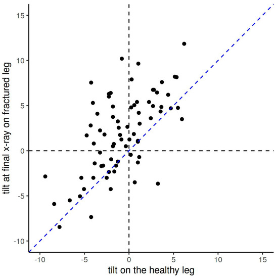 Comparison of the anterior tilt angles between the fractured and the healthy leg at the final x-ray among children with trampoline fractures of the tibia. After remodeling, the anterior tilt angle in the injured leg is still larger than on the opposite healthy leg, as shown here by the majority of anterior tilt angle values (black dots) above the bisecting blue line.