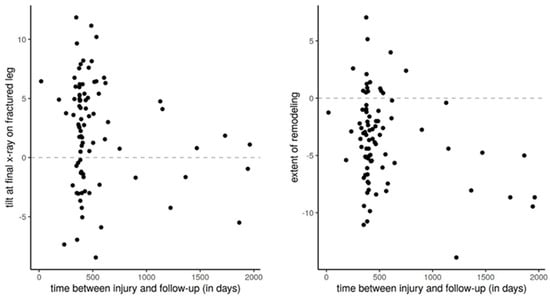 In 30/72 patients, the anterior tilt angle was ≥0° at the final examination. In these children, the initial anterior tilt angle was significantly larger than in children with an anterior tilt angle ≤0° at the final exam (7.2° vs. 4.8°, p = 0.008; Table 4), despite similar age and sex distributions between groups. Similarly, patients with a large tilt angle on the healthy leg also tended to have a large tilt angle on the fractured leg at the final examination, and thus, they were more often classified as incomplete remodeling (Figure 4).