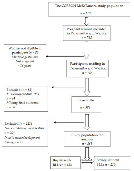The BSID III was used to determine neurodevelopment, which was completed when the children were between 12 and 24 months of age. The BSID III is a widely used, individually administered, age-adjusted instrument designed to measure cognitive, motor, language, social-emotional, and adaptive behavior developmental functioning of infants and toddlers from 1 month to 42 months of age and to identify possible neurodevelopmental delay or disabilities [43,44]. The BSID III has recently been validated for use in Suriname [45]. The BSID III consists of a series of developmental playing tasks used to assess cognitive, motor, and language development of infants and toddlers [44]. Assessment of the social-emotional domain was conducted using primary caregiver responses to a questionnaire. Infants born premature at a gestational age less than 33 completed weeks or with a birth weight less than 2000 grams or infants and toddlers with a significant medical or neurological condition, including Down’s syndrome, autism, hydrocephalus, cerebral palsy, or significant visual or hearing impairment preventing neurocognitive testing, were excluded. Testing was performed by psychologists or trained researchers who were blind to the data on maternal prenatal NCSs and blood lead levels. Consistent with BSID III administration instructions, chronological age was calculated and utilized to determine the age-specific start point before administration. Administration and interpretation of the BSID III was based on the instructions in the technical manual [44]. After the assessment, the examiner summarized the raw score of each domain, converted them to scaled scores, and rechecked the scores before entering them in the database. The primary outcome measures were the scaled scores of the cognitive, gross and fine motor, receptive and expressive language, and social-emotional development domains, ranging from 1 to 19 with a mean of 10 and a standard deviation of 3. The scaled scores were analyzed as continuous variables. In total, 363 valid BSID III assessments between 12–24 months of age were analyzed (Figure 1).