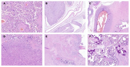 Main histopathological findings. Magnification 4x, hematoxylin-eosin (A) normal, (B) Chiorioamnionitis, (C) vasculitis, (D) ischemic necrosis, (E) fibrinoid necrosis, and (F) dystrophic calcifications.