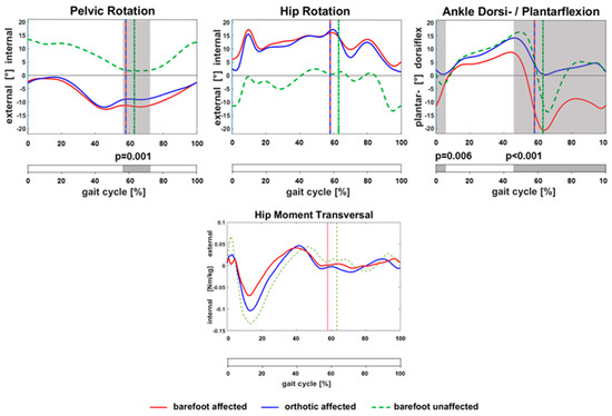 Statistic parametric mapping of kinematics of pelvic rotation, hip rotation, ankle flexion, and hip movement during gait. Grey area: significant changes on affected side between barefoot (red curve) and walking wearing orthoses (blue curve). The kinematics of the unaffected side (green curve) are shown as a reference.