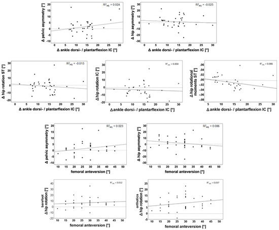 The changes in the ankle position at IC did not relate to the changes in pelvic asymmetry (β = 0.222, p = 0.189), hip asymmetry (β = −0.128, p = 0.662), Δ hip rotation at ST (β = −0.195, p = 0.486) and at IC (β = −0.096, p = 0.731), or Δ hip rotational moments at ST (β = −0.001, p = 0.109) (See Figure 3). Femoral anteversion did not show a relationship with rotational asymmetries (pelvis: β = 0.139, p = 0.190) (hip: β = −0.196, p = 0.280). The changes in the hip rotation at IC to MST did not relate to the femoral anteversion. This could be shown with orthoses (β = 0.124, p = 0.278) and barefoot (β = 0.98, p = 0.542).