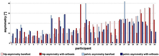 Illustration of hip (red) and pelvic (blue) asymmetry barefoot (light colored) and with orthosis (dark colored). X-axis: 34 patients (4 bars per participant), in order of ascending hip asymmetry barefoot. Y-axis: absolute value of difference in affected and unaffected sides.