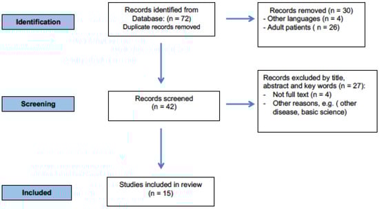 Keywords (alone and/or combined) were used to select relevant articles, in particular: (“Systemic Lupus Erythematosus” AND (“Intestinal Involvement” OR “Intestinal symptoms” OR “Gastrointestinal” OR “Hepatic involvement” OR “Pancreatic involvement” OR “mesenteric vasculitis” OR “peritonitis” OR “intestinal pseudo-obstruction” OR “protein-losing enteropathy”) AND (“Child” OR “Children” OR “Childhood”), (see Figure 1).