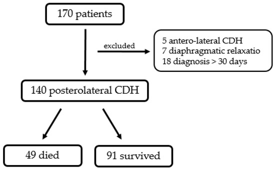 In the study period, 170 neonates were treated for CDH at our department. One hundred and forty patients suited inclusion criteria, while thirty of them (17.6%) were excluded from the study: five patients presented with a Morgagni (antero-lateral CDH); seven neonates were diagnosed with diaphragmatic eventratio/relaxatio; and eighteen patients were diagnosed with CDH after 30 days from birth.