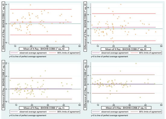 The mean age among all the enrolled patients was 12.51 years. The scoliosis magnitude was 20.54 ± 9 Cobb degrees. Measurements in Cobb degrees acquired at t0 with BHOHB were 20.87° (±9.1 SD) for the first operator, while those of the second operator were 20.82° (±8.67 SD). At t1, the values were 20.23° (±8.93 SD) for the first operator and 19.90° (±8.96 SD) for the second operator.