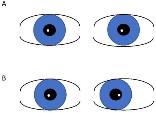 Hirschberg test demonstrating light reflex in same location in aligned (orthophoric) eyes (A) and temporal displacement of the light reflex in esotropia (B).