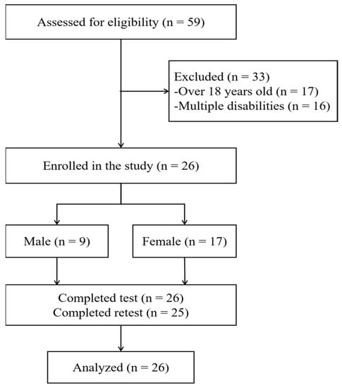 As depicted in Figure 1, a total of 59 participants were assessed for eligibility and 33 participants were excluded. Of these, 16 were diagnosed with multiple disabilities, meaning that they were diagnosed with a secondary disability condition in addition to HI (e.g., intellectual disability, physical disability, and visual impairment), and 17 did not meet the age criteria (i.e., they were either below 7 years or above 17 years). Finally, 26 participants were included in this study; 9 of whom were male (Mage ± SDage: 11.9 ± 3.4 years) and 17 were female (Mage ± SDage: 13.1 ± 2.5 years). The majority of the participants were diagnosed with level I HI (80.8%), i.e., the most severe impairment level. In addition, there were no sex differences in age, height, and weight (all p > 0.05; see Table 1).